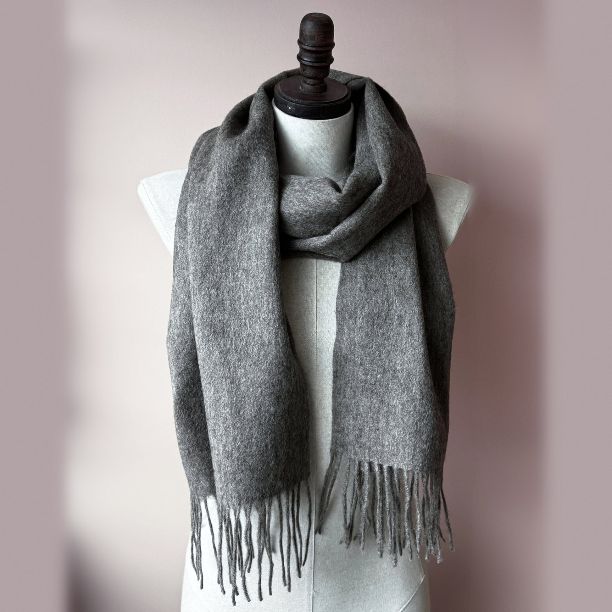 Charcoal Lambswool scarf with tassels.