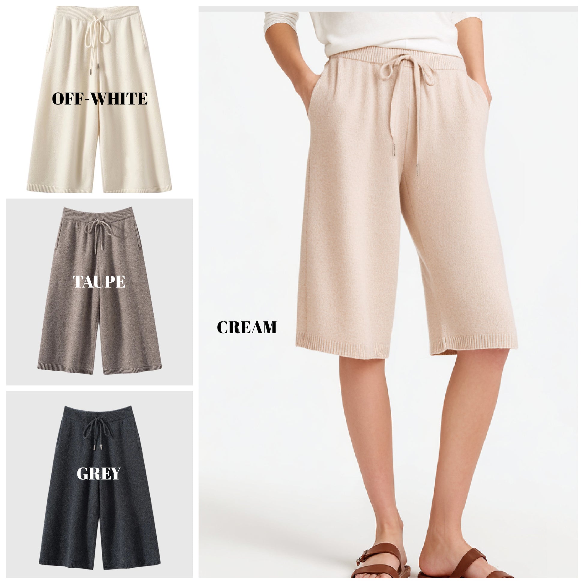 Cozy and elegant, sweater-weight pure cashmere knit long shorts or capris.