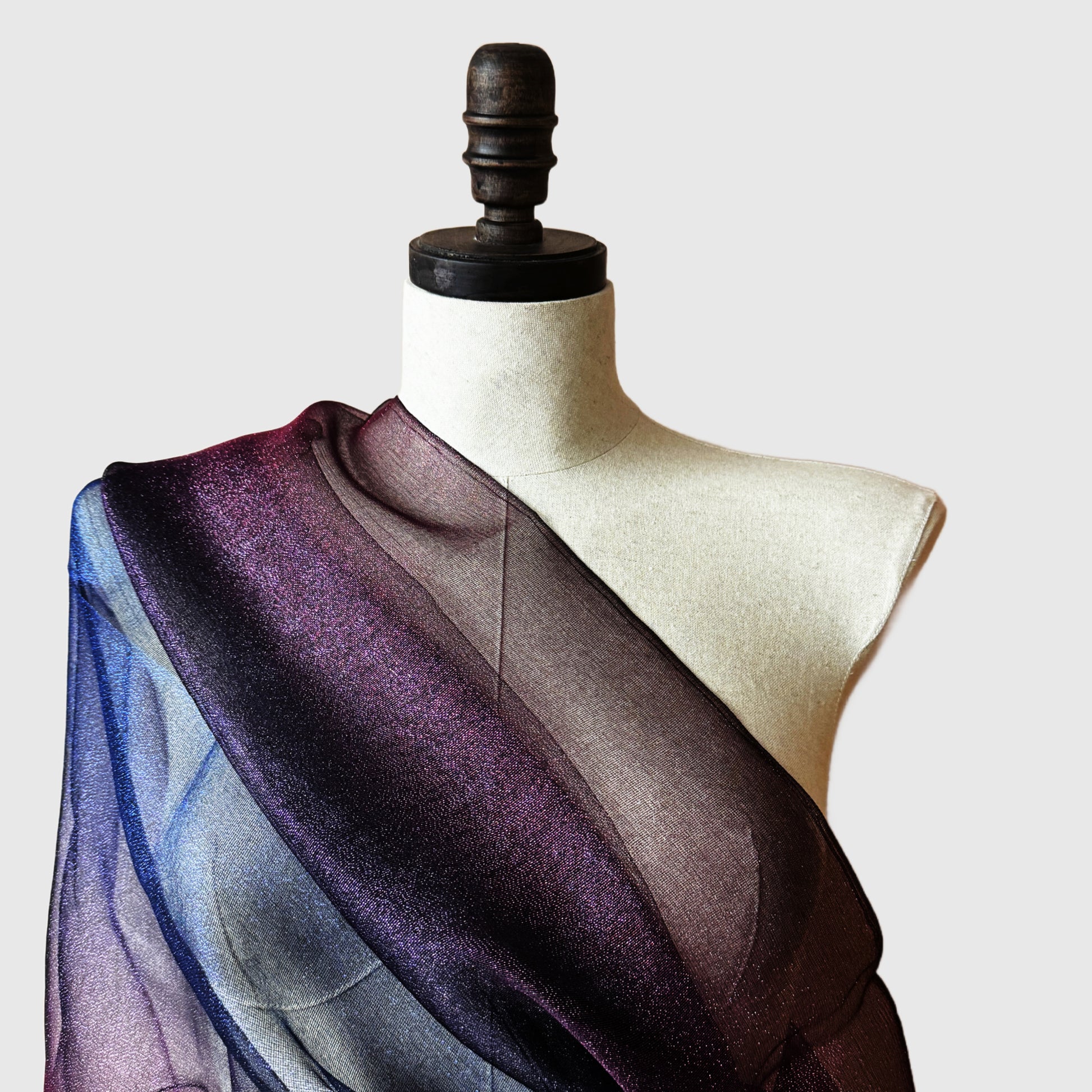 Stunning Silk blend oversized shawl in gradient shades of dark jewel colours: from brilliant purple to deep blues and black.