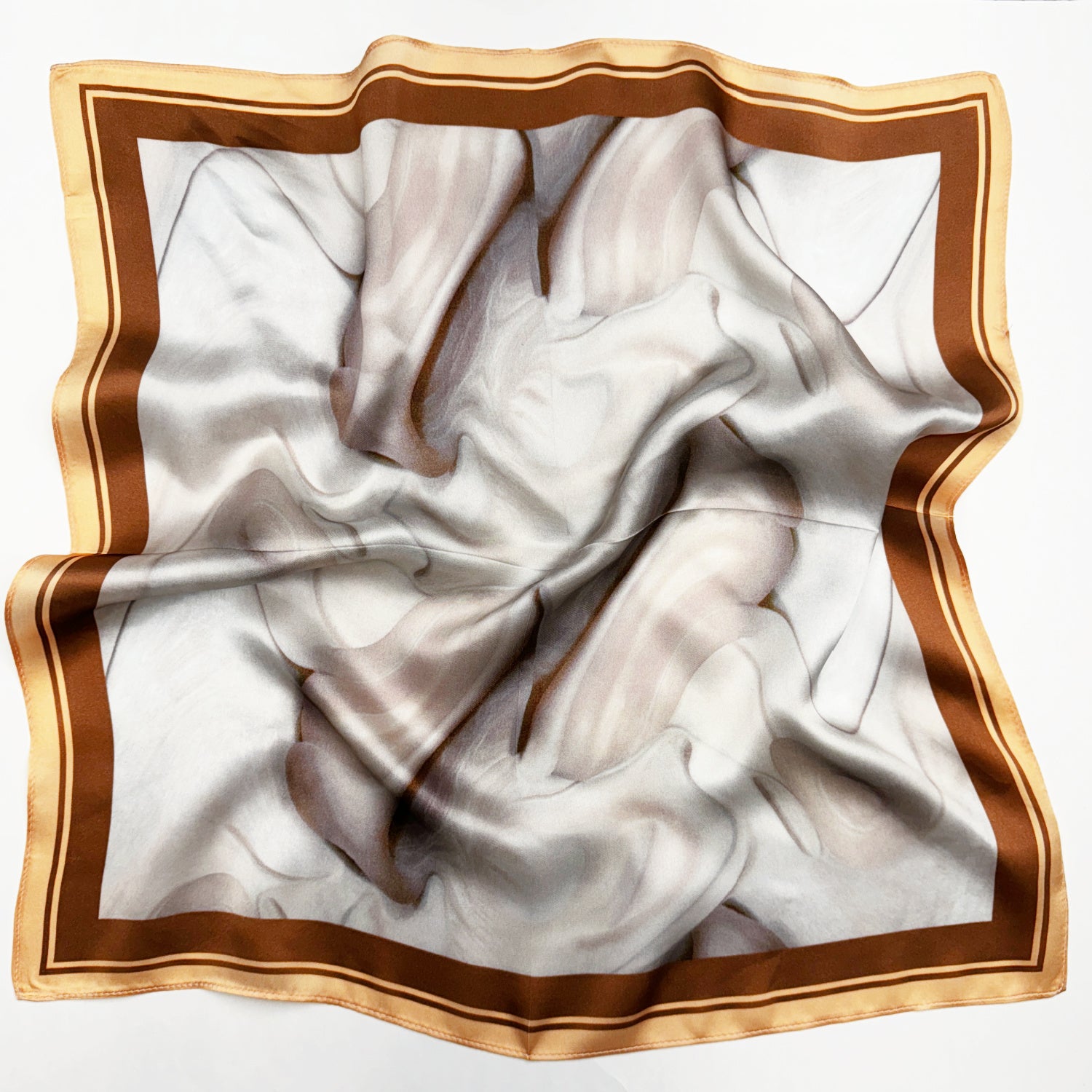 Beautiful 100% Mulberry Silk Neck Scarf featuring soft hues of taupe and grey pattern.