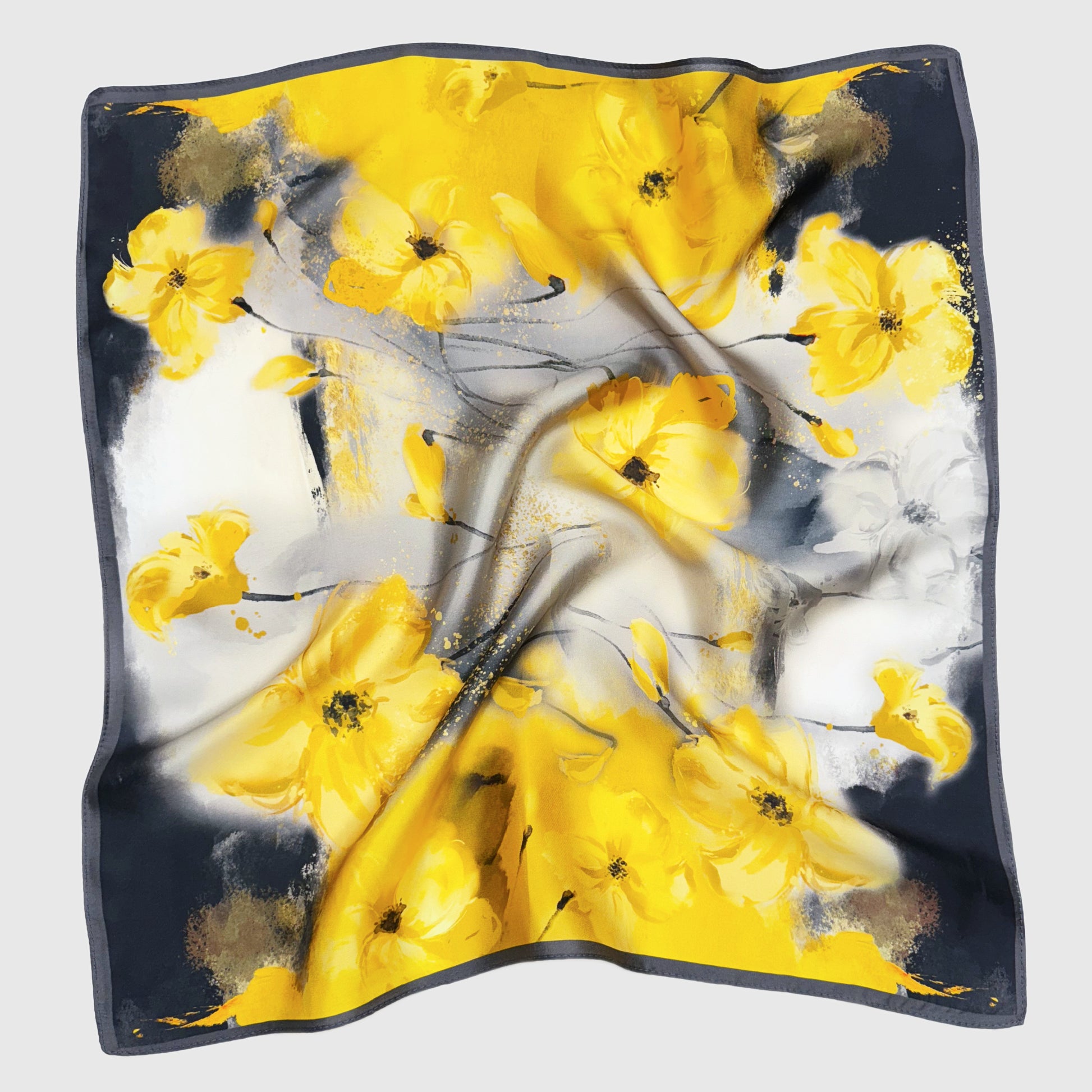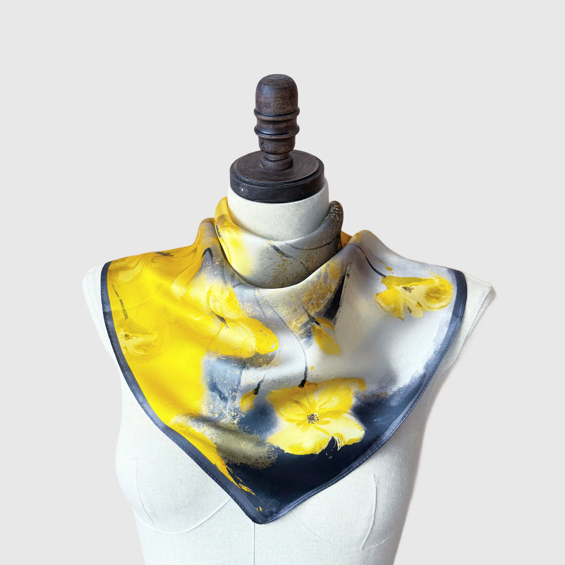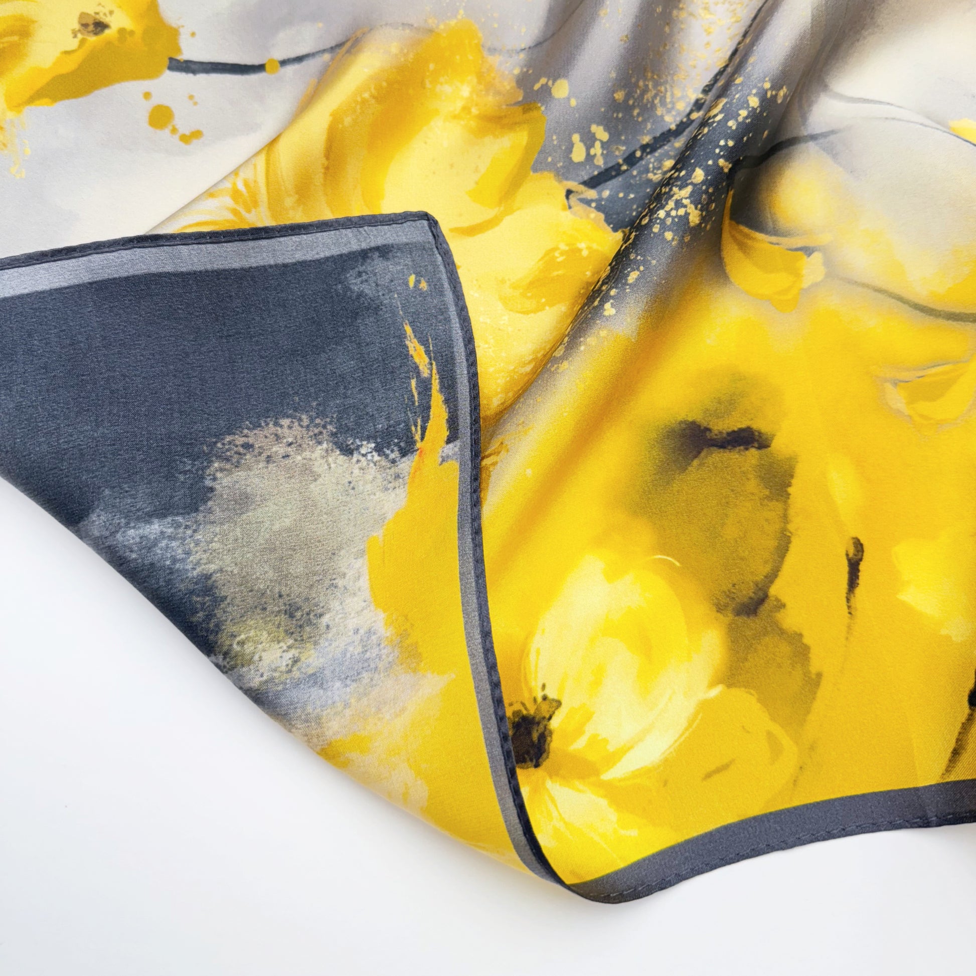 Yellow Grey Floral Silk Neck Scarf | Silk Summer Neck Wrap